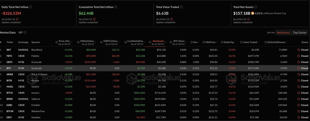 As of October 13, the total net asset value of Bitcoin spot ETFs stood at $157.18 billion, representing 6.81% of Bitcoin’s total market capitalization. Trading volumes reached $6.63 billion for the day, underscoring elevated activity amid market uncertainty.