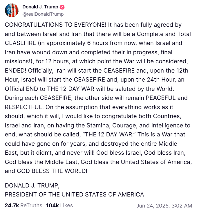 Trump credited early Iranian warning of a retaliatory missile strike for avoiding casualties at U.S. bases in Qatar, which helped pave the way for the truce. As regional hostilities paused, investors rotated out of defensive positions and re-entered crypto markets.