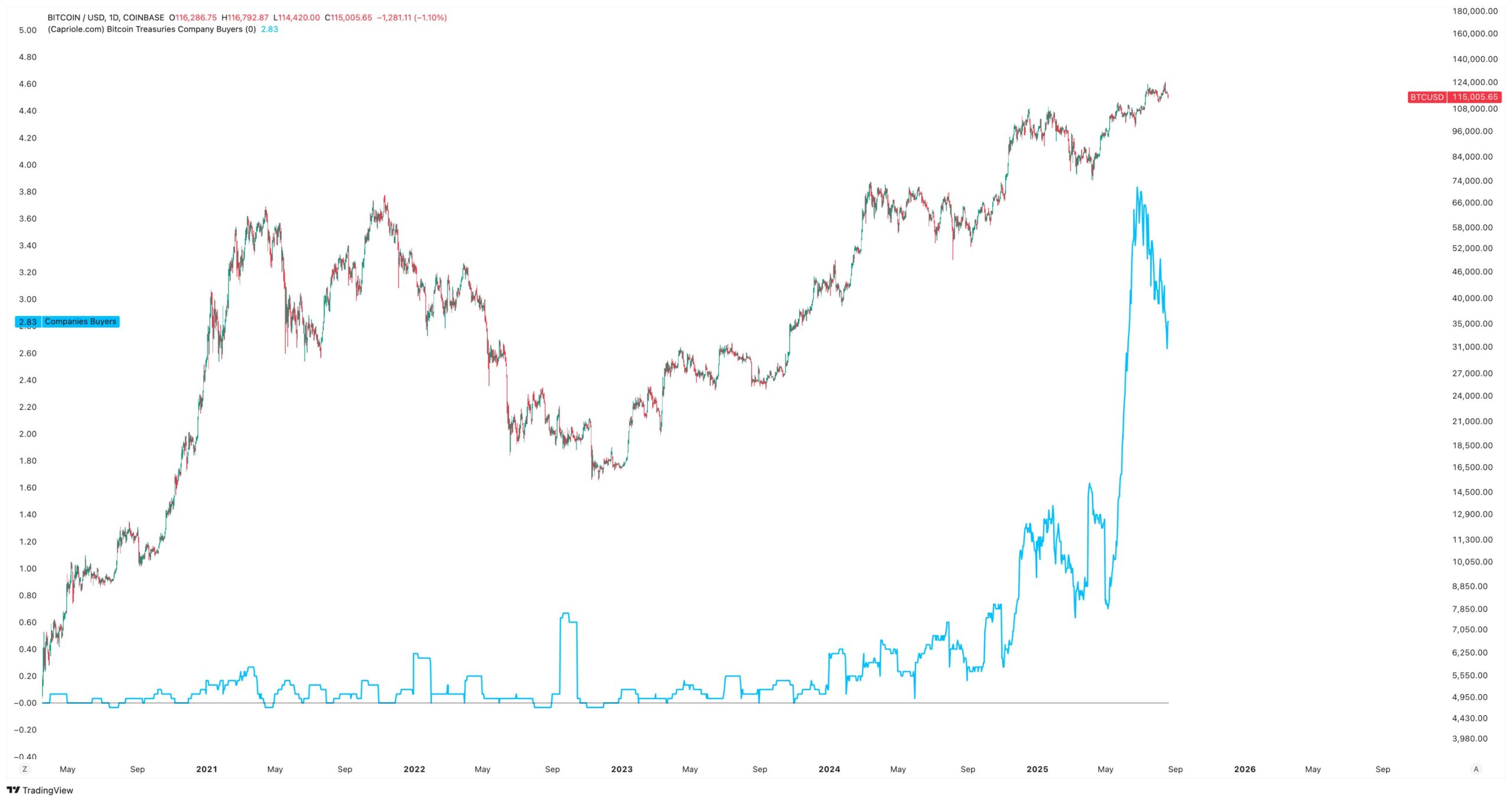 The number of companies buying Bitcoin for their treasuries has dropped to just 2.8 per day, despite the pioneer crypto’s recent record-setting price performance.