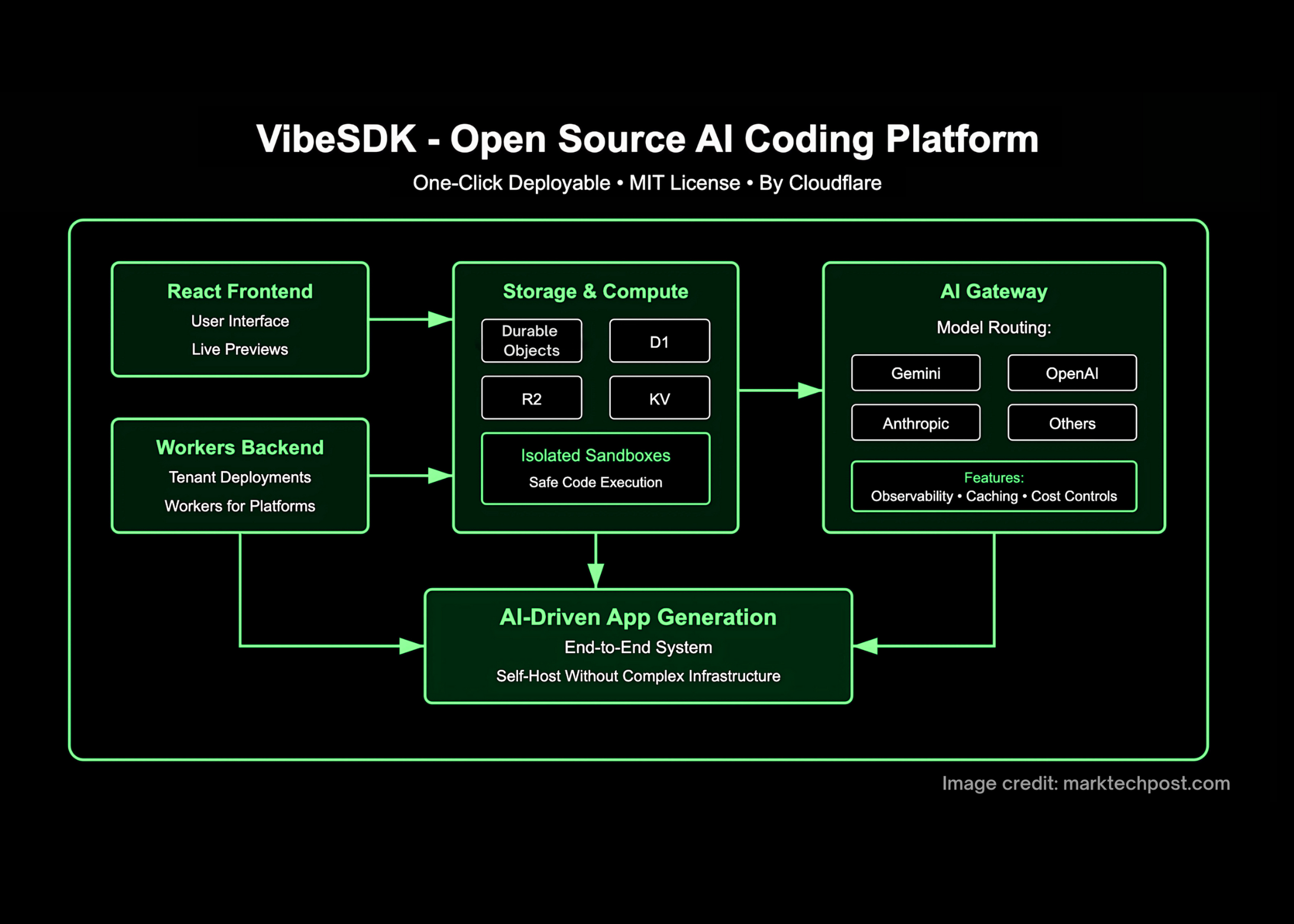 Cloudflare’s VibeSDK turns “vibe coding” from demo to deployable substrate: a one-click stack that routes LLM calls through AI Gateway, executes AI-generated code in isolated sandboxes/containers, and publishes tenant-scoped Cloudflare Workers via Workers for Platforms; paired with project export and a formal reference architecture, it gives teams a reproducible path to ship AI app builders without re-inventing the runtime or safety model.