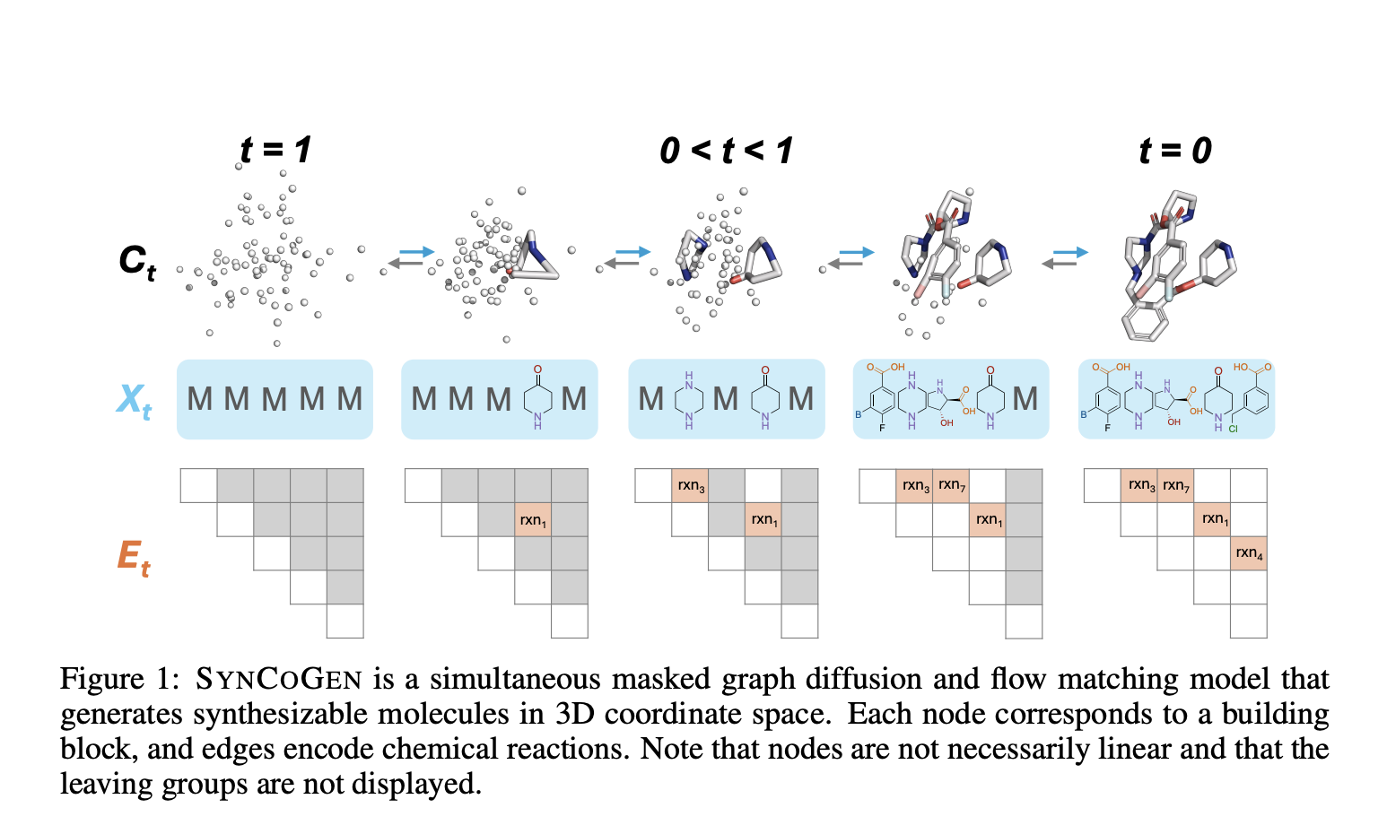 - Multimodal Generation: By blending masked graph diffusion (for reaction graphs) with flow matching (for atomic coordinates), SYNCOGEN samples from the joint distribution of building blocks, chemical reactions, and 3D structures.